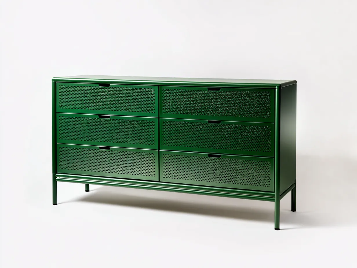 Esta cómoda metálica en verde intenso combina capacidad de almacenaje y una estética industrial limpia, ideal para dormitorios, estudios o espacios auxiliares que buscan una pieza funcional con personalidad. Su frente perforado aporta textura visual y una imagen ligera, mientras que la estructura elevada refuerza un estilo moderno y práctico. El formato horizontal permite integrarla fácilmente en interiores contemporáneos, urbanos o de inspiración utilitaria.